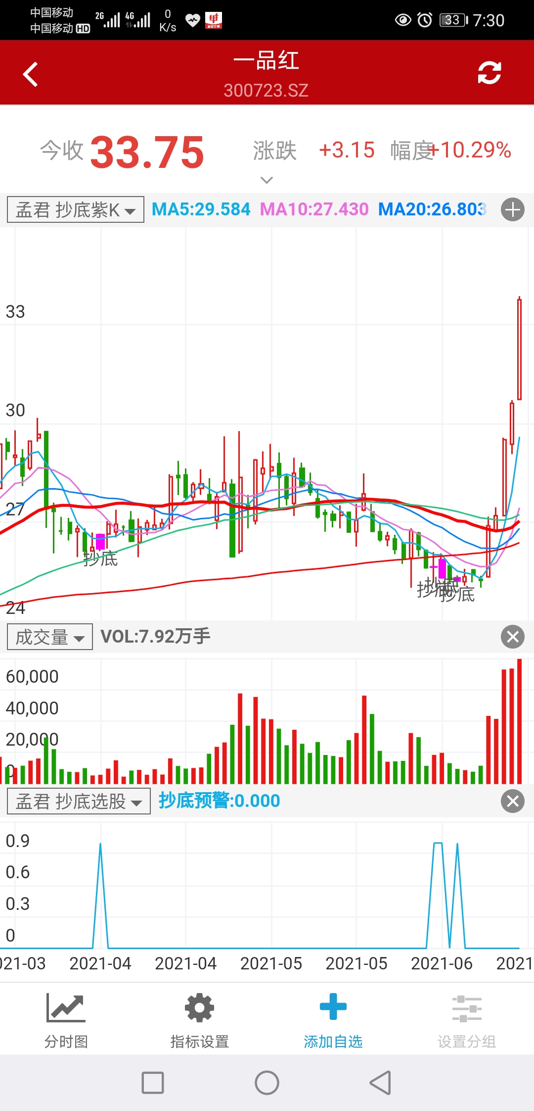 一品红的紫色抄底信号十分经典,具有代表性!4月9日的信号出现后一波回升,近期的6月16、18日二次出现抄底信号,稍微低位震荡之后出现一波猛烈大涨!不过我也没有及时关注到此股,可惜!高了就不适合去追了,追高就不是抄底潜伏思路了。本人实盘近日依据紫色抄底信号操作的是五矿稀土,暂时还没有出局,到时看情况止盈。