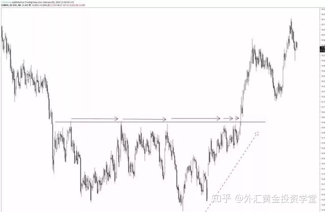 上图中,白银价格多次触及同一阻力位,即图中实线箭头所标注。这说明每一次都有越来越少的卖家想要在阻力位继续卖出。于是阻力位变得更弱。在突破发生前,市场在加速上行,如虚线箭头所标注。最后,价格突破了阻力位。