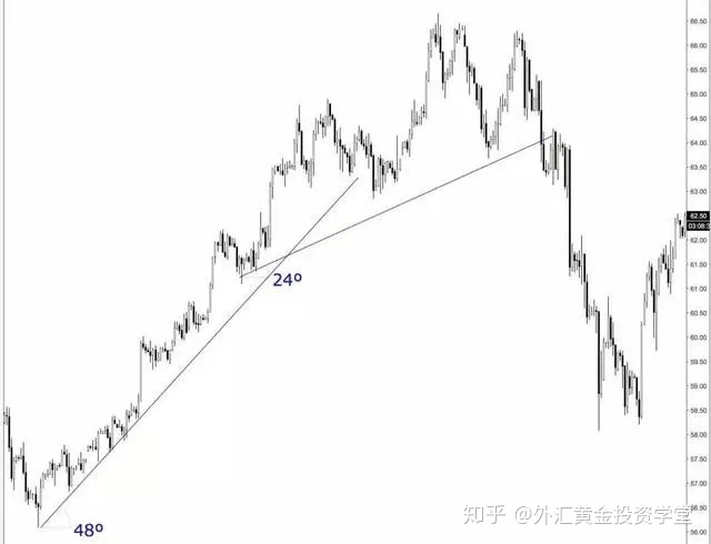 我们还可以发现,当趋势波长变短时,伴随着这个趋势线的倾斜度也会变得更平,意味着趋势减弱。上图就能看到趋势线在上涨行情中倾斜度的变化: