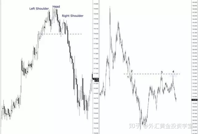 下图左侧出现了一个头肩底形态,这个形态正好在右侧图中标出的长期阻力位。4这个位置就是头肩底形态形成的位置。在做图表分析时,不断放大缩小图表,找到这些重要的线索。