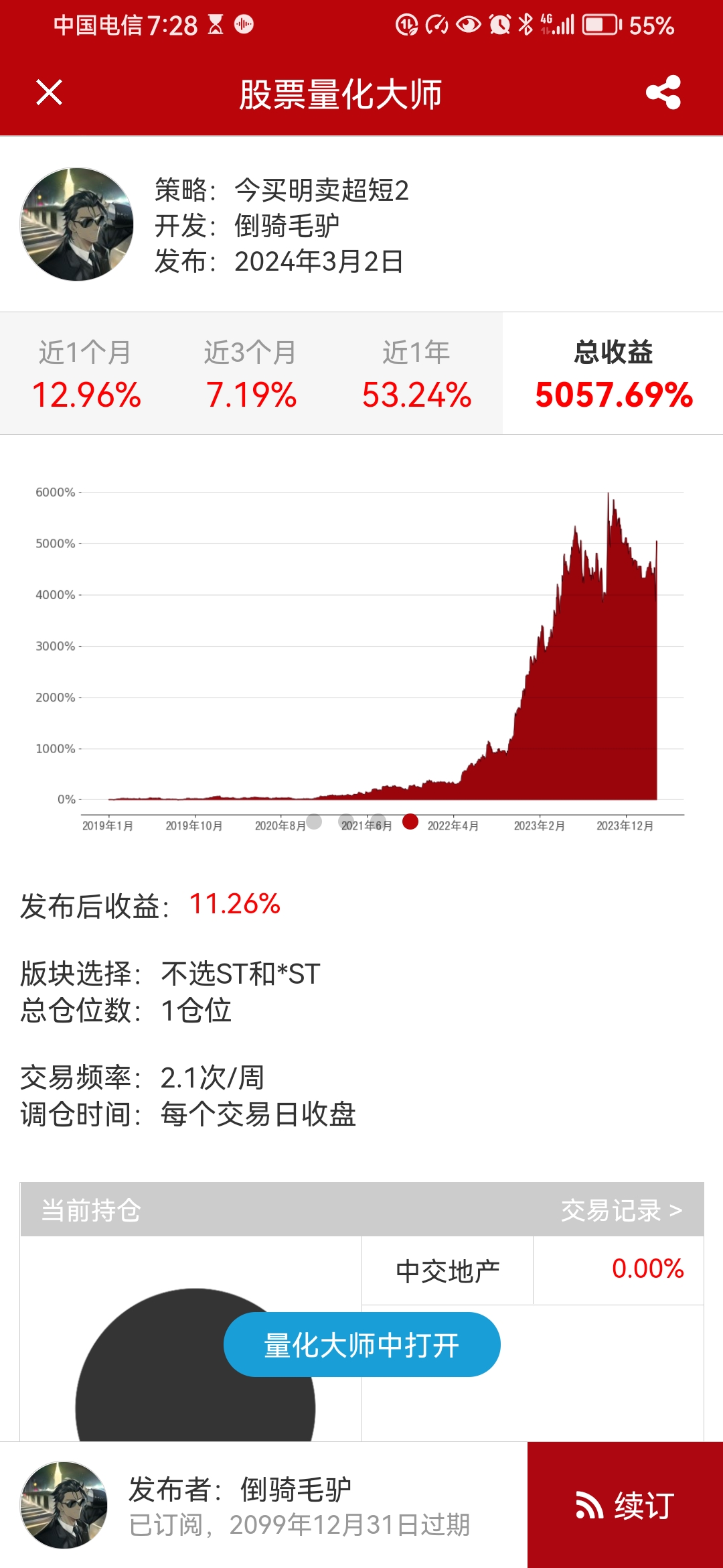 发布后收益11%,今买明卖策略,限时免费,操作简单,尾盘选股,次日尾盘出,有历史回测数据,欢迎免费订阅试用。 作者:倒骑毛驴 更新:2024-03-30 07:41 公式:今买明卖㊙️超短 赏 阅读 1944