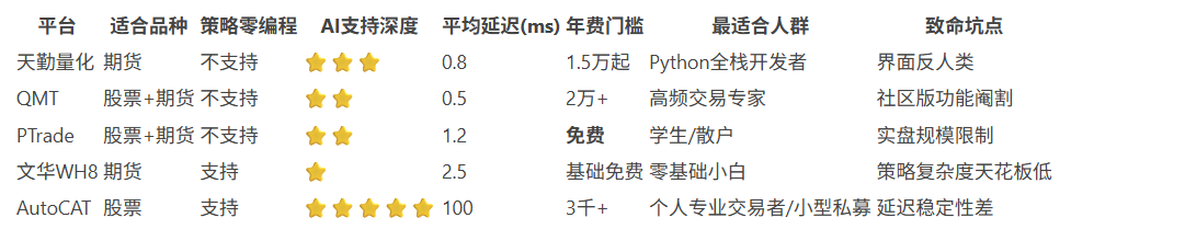 没有完美的平台,只有最适合你的武器库。高频玩家选QMT,Python极客用天勤,白嫖党抱紧PTrade,不会写代码的专业交易者或小型私募用AutoCAT——2026年用对工具,让你的策略效率飙升300%!