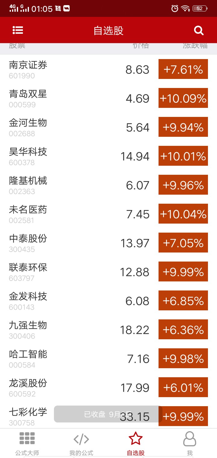 盘中抓涨停 关注公众号“ 肥尾量化平台 ”,公式 一键选股 每日盘中通过量比,涨幅,涨速,乖离率,精选出大概率涨停的个股。话不多说,昨天盘中选出13只个股,8只涨停,剩下的也是大幅上涨。强调一点,买入时千万不要追高,涨价5个点就换别的。因为追高买的,明天不一定有溢价。切记! 这是昨天9.6转出来的13只票,8只涨停。大家可以复盘看一下。珍惜机会!