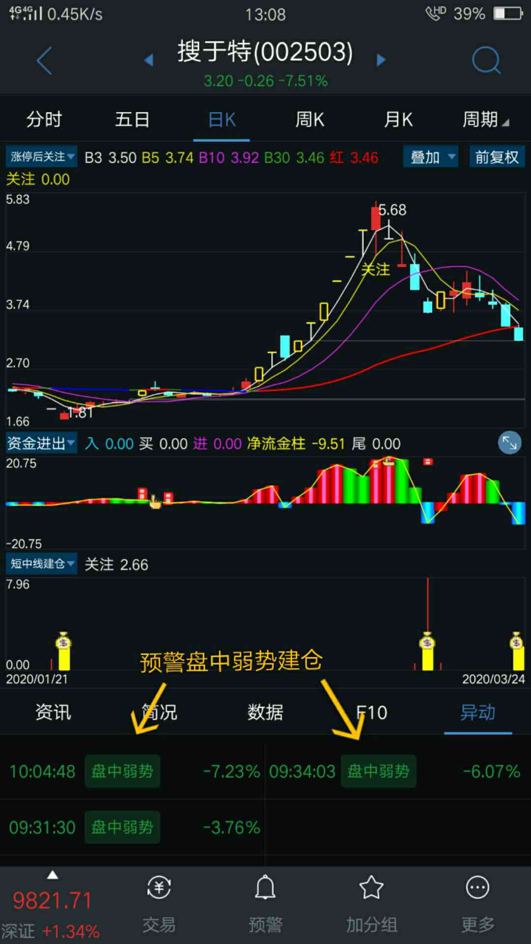 选出放自选股 ,预警出现盘中弱势建仓 一成。卖出见前面发布〔资金进出〕买卖法。(自己常用选股指标 赚钱成功率100%)