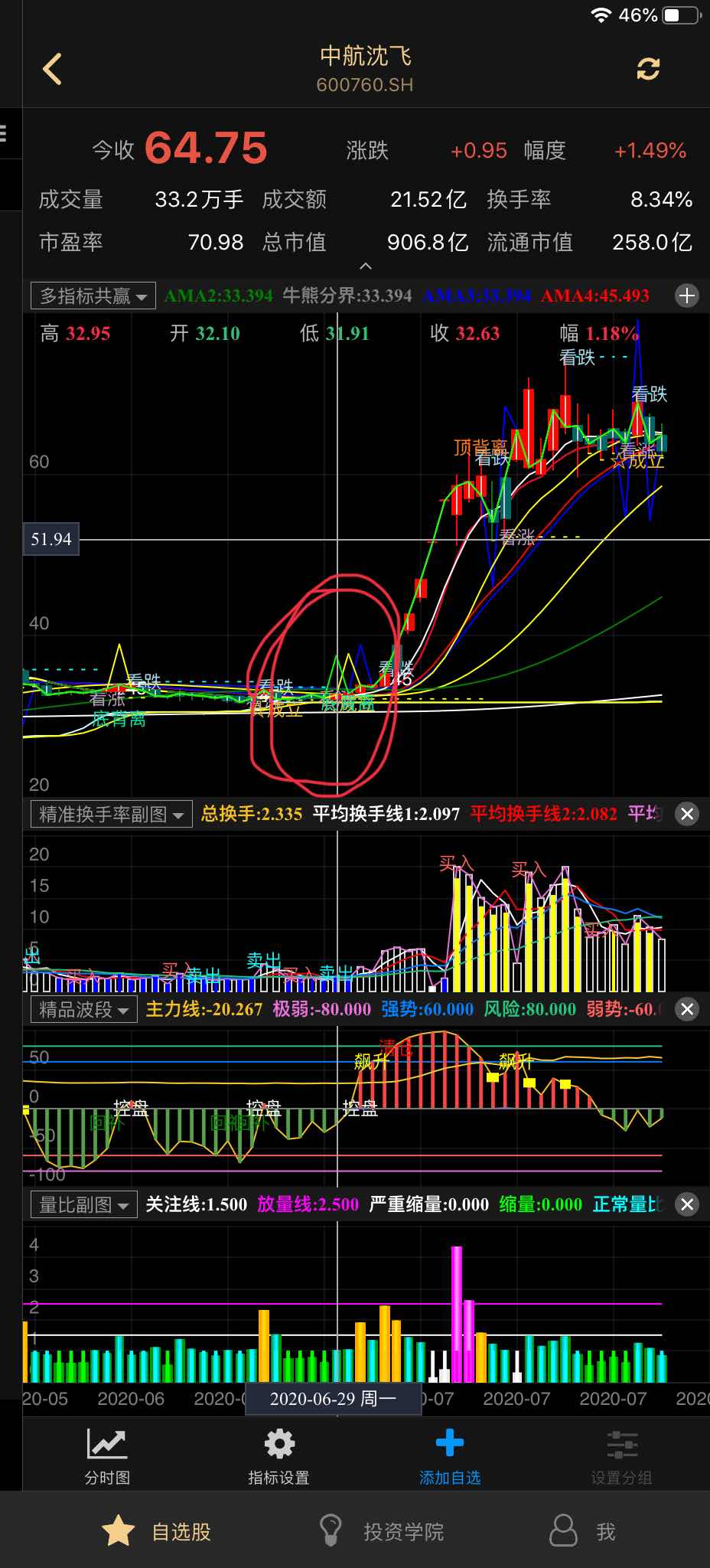 多指标共赢 关注公众号“ 肥尾量化平台 ”,公式 一键选股 绿线锥形出现时,买入,至于什么时候卖出,可以参考其他指标,但经过一周测试,每日竞价选出的强势股(成交量或放大,可参考我的其他公式看成交量),开盘买入大涨的概率较大,而且涨势往往会持续多日,可看情况卖出。第一个月先按30给大家优惠使用,之后会改为100,大家可以先试试。