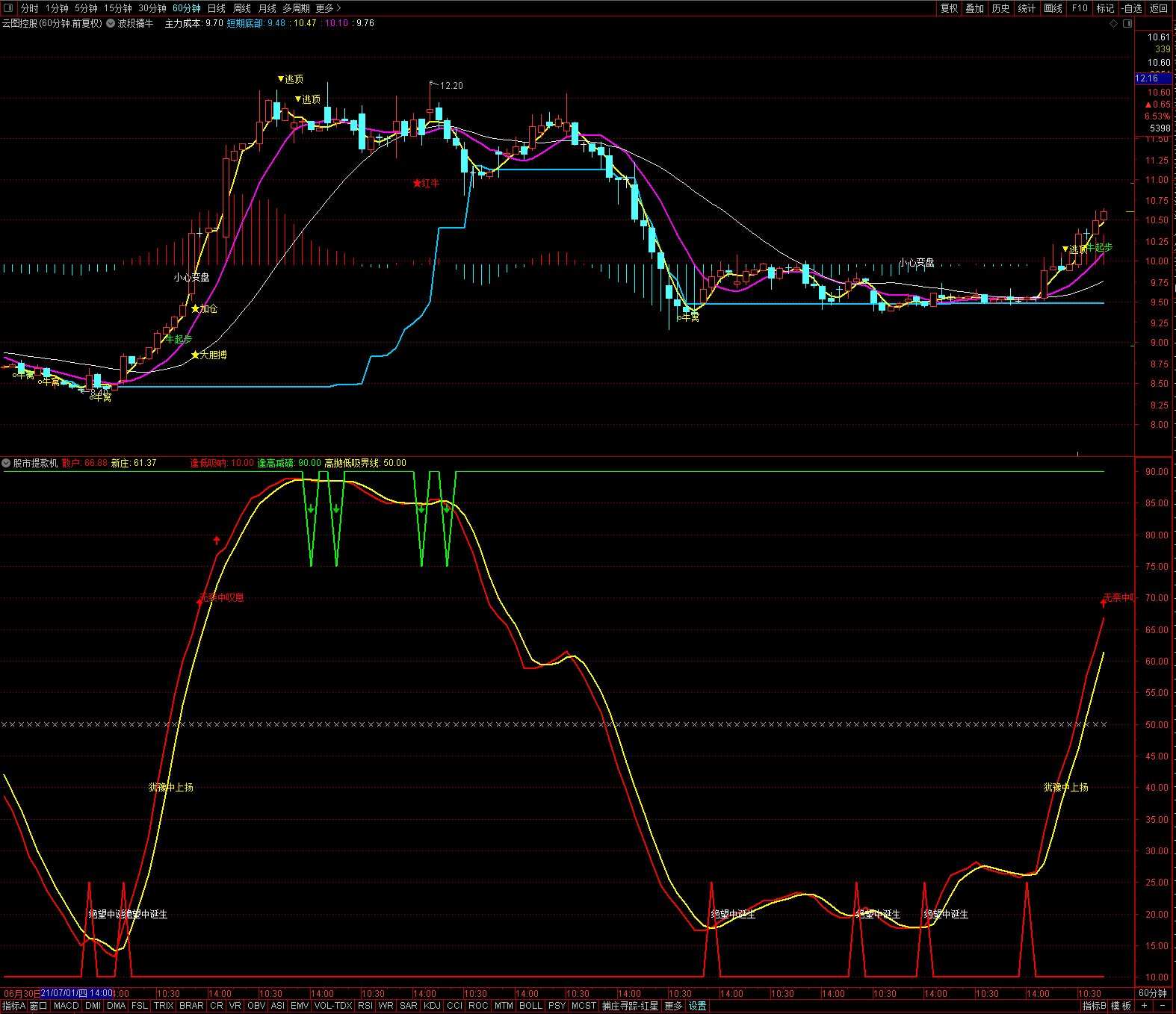 🔥🔥老妖—波段擒牛主图指标 关注公众号“ 肥尾量化平台 ”,公式 一键选股 电脑手机都可以用⚠️订购送该指标送主图源码。上方显示能量多空,红色为多头,绿色为空头。下方蓝色为支撑线,到支撑位不破可抄底,上方三条为均线,皆有文字提示买卖,显示买入、加仓和逃顶。