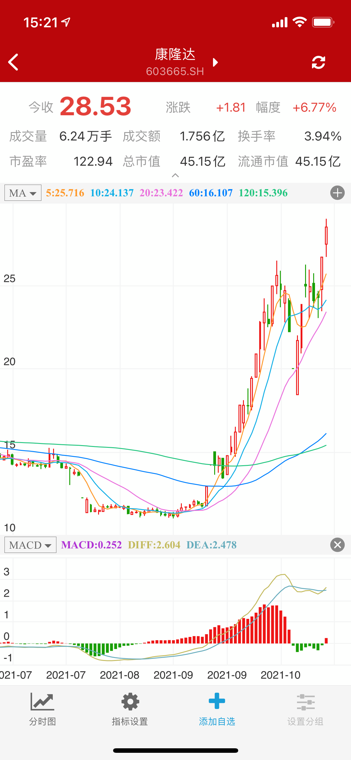 macd零轴水上金叉 关注公众号“ 肥尾量化平台 ”,公式 一键选股 Macd零轴水上金叉,顺势交易。可以作为一个参考点买入,跌破买入信号的最低点设为止损位。结合大盘走势,个股基本面成功率高一些 股票:康隆达 代码:603665 日期:2021-06-25 ~ 2021-11-02