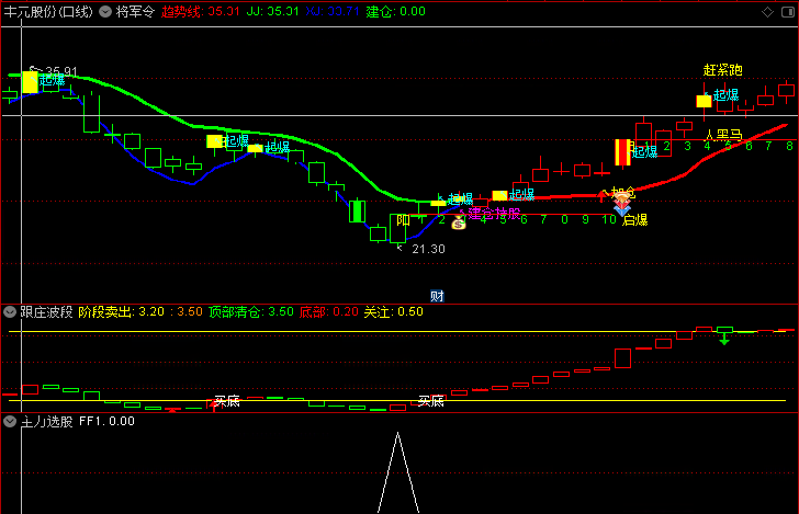 指标出现在盘整和下跌等弱势行情时,该位置为短期低点,后期多为横盘涨幅比较小,介入后三天内获利了结,获利3点左右