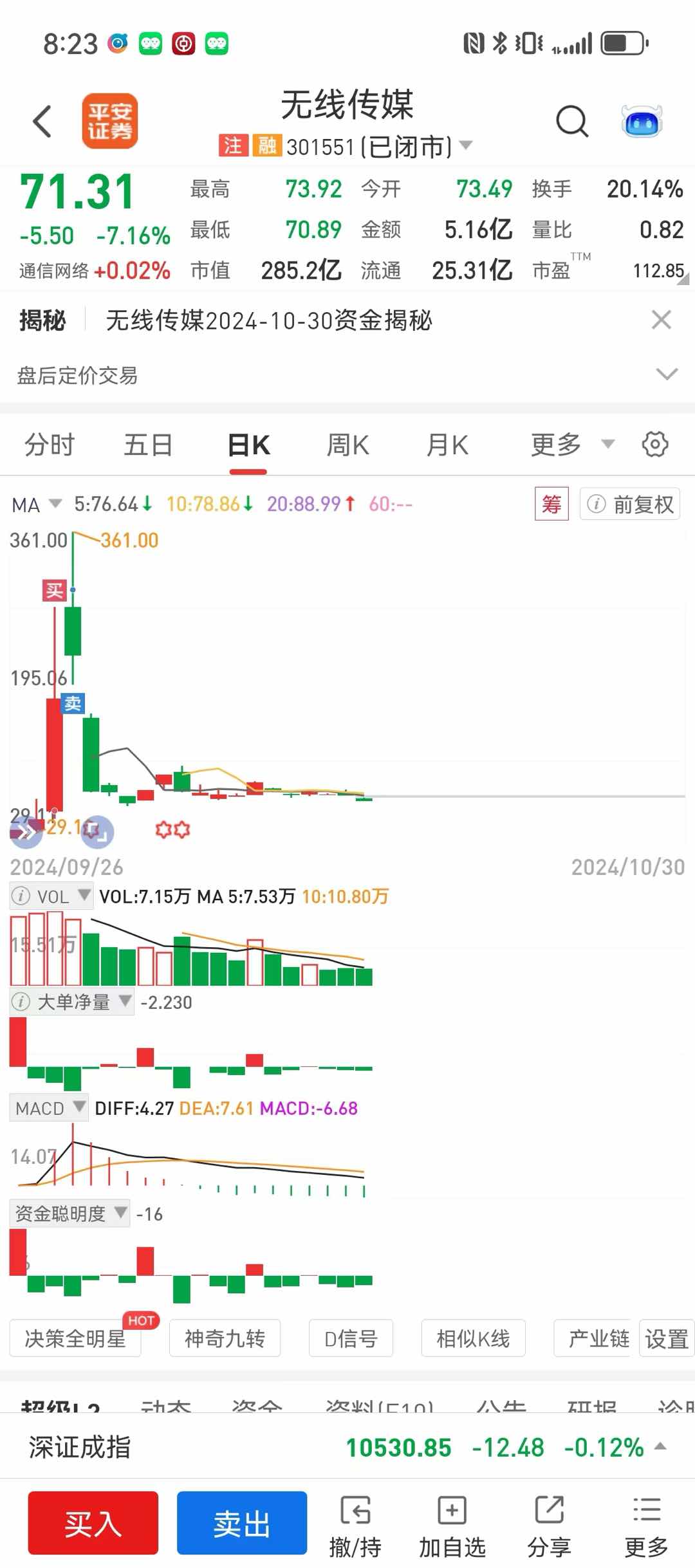 60远附近低吸介入C无线,10月8日,高位300元附近止盈,几天交易日盈利6倍。图附文后。