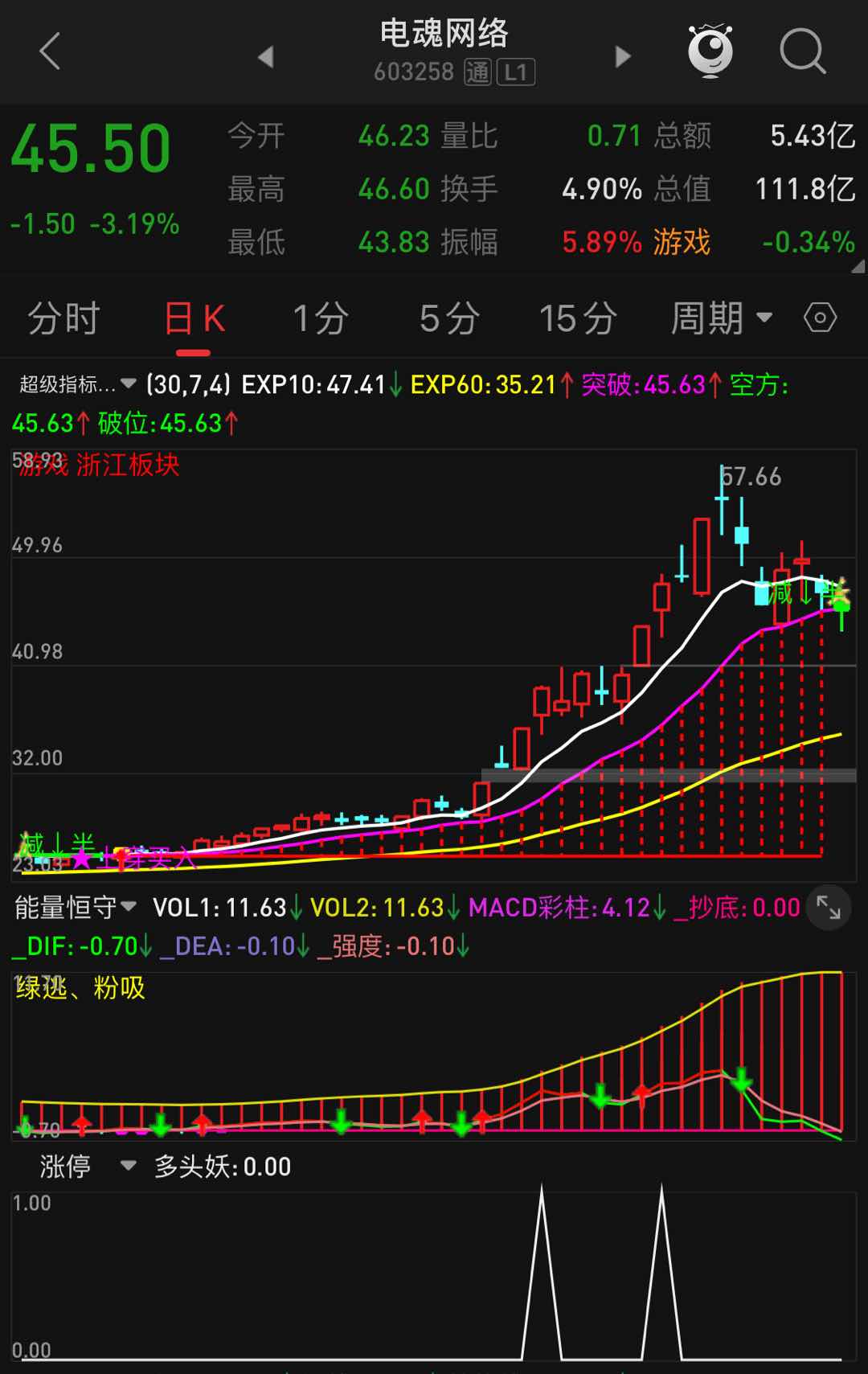 日日都有收益,月收益率80%以上。 关注公众号“ 肥尾量化平台 ”,公式 一键选股 早上选出,再选出当前热点板块,选一到二只,分20%仓位,当天涨停板看封单量,第二天不涨停一定要清仓。四月份战绩请看图说话,一个月不底于80%收益率。小白的福音。