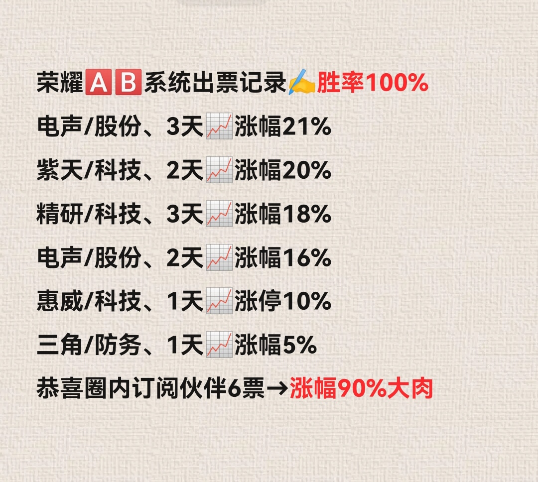 极品创业系统,紫天科技📈21%收益。 关注公众号“ 肥尾量化平台 ”,公式 一键选股 专注热点创业抓牛,稳定复利!准确率99%,低吸买进,提示买卖点,有庄有我,跟随资金操盘,欢迎订阅购买,欢迎实力验证,分仓买票,舒服吃肉!!!!极品🅰️系统出票记录✍️胜率100%电声/股份、3天📈涨幅21%紫天/科技、2天📈涨幅20%精研/科技、2天📈涨幅13%电声/股份、2天📈涨幅12%恭喜圈内订阅伙伴4票→涨幅61%大肉