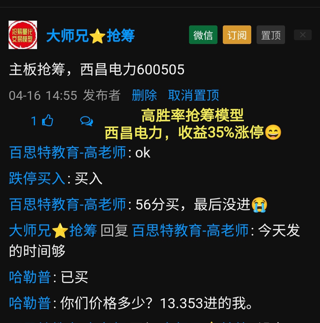 订阅每日一只【京华激光】涨停46%连板😄 关注公众号“ 肥尾量化平台 ”,公式 一键选股 主板板抢筹票!上周大肉回顾😄 推送主板【华升股份】涨停收益18% 推送主板【视觉中国】涨停收益20% 推送主板【物产金轮】大涨收益5% 推送主板【富煌钢构】涨停收益10% 欢迎订阅服务收票,推送一天一股,躺赢吃肉,一次订阅5个月送(抢筹分时神T)指标。