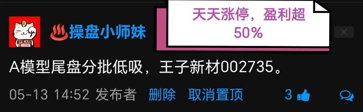 🎉欢迎订阅置顶第一个或第二个,涨停A模型,B模型,五月份胜率百分百,天天吃肉!订阅三个月,领取指标一份!