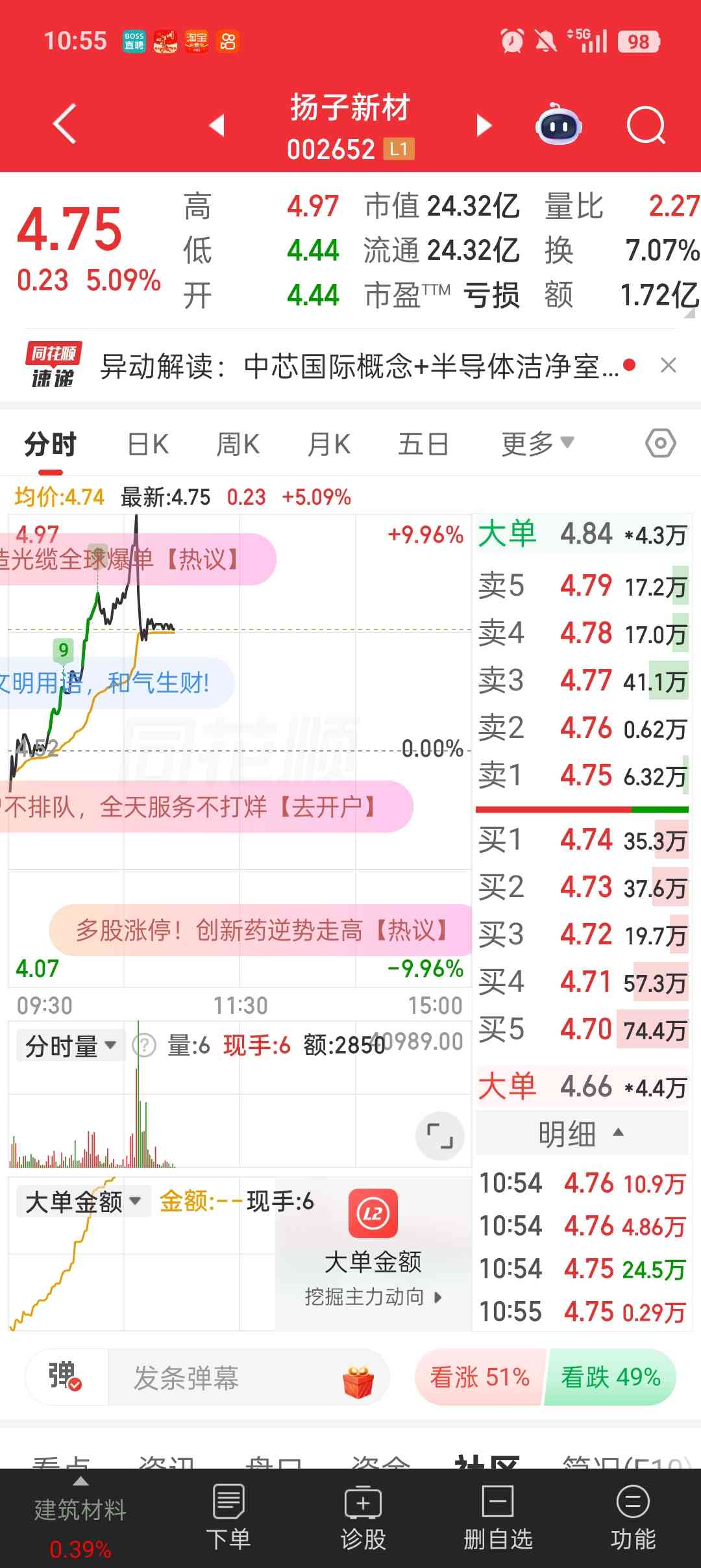 杨子新材爽歪歪10个点,今日继续低吸